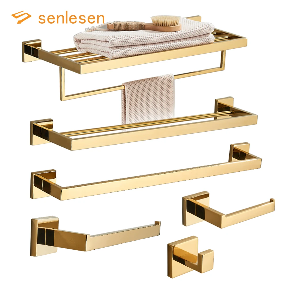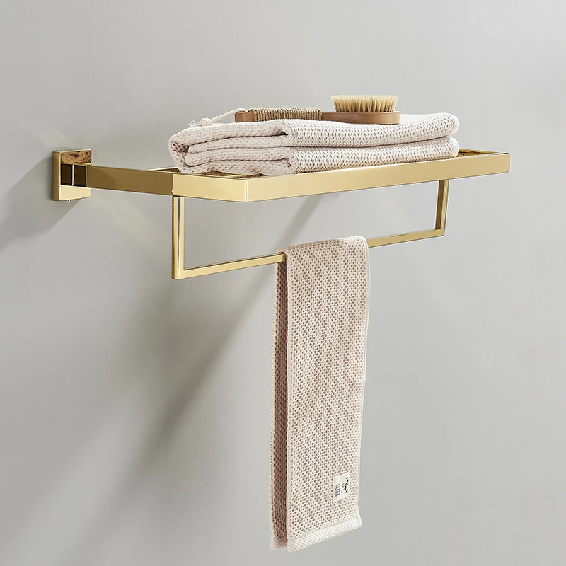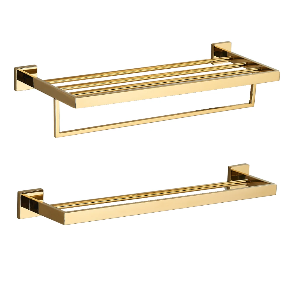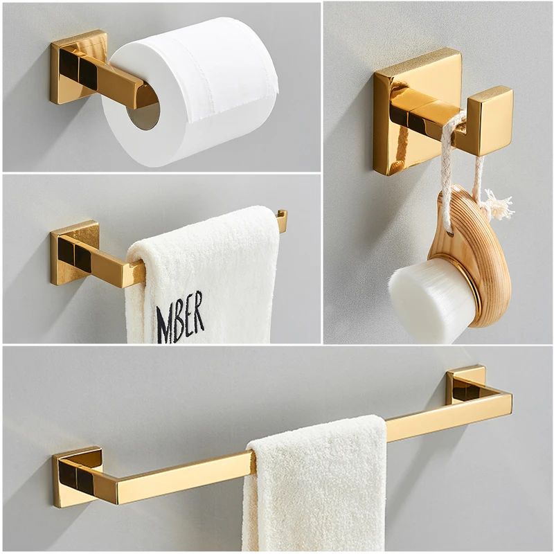 Conjunto de acessórios para banheiro fabricado em aço inoxidável, com acabamento dourado, desenvolvido para organização e suporte de toalhas e acessórios. Produto resistente à umidade, indicado para instalação em parede, com design funcional e acabamento metálico de alta durabilidade.
